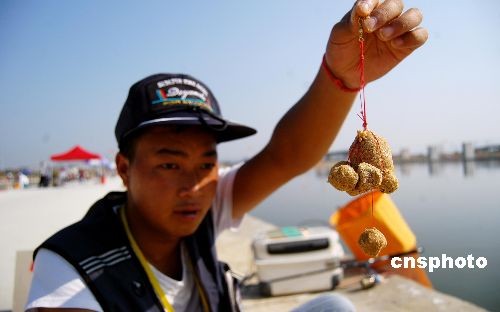 十月二十八日,在福建南安八月湖舉行的第六屆全國農(nóng)運(yùn)會(huì)釣魚比賽正有條不紊進(jìn)行著。圖為拋桿釣比賽選手做好的魚食尤為有趣。中新社發(fā) 傅丹丹 攝