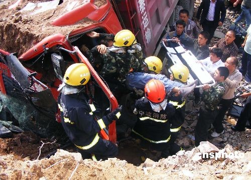 圖:大卡車制動失靈撞向山石 司機被埋(2)