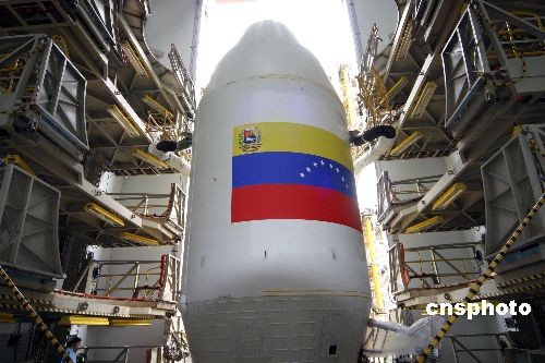 發(fā)射前位于運載火箭頂部的衛(wèi)星整流罩外印有委內瑞拉國旗。中新社發(fā) 尹濤 攝