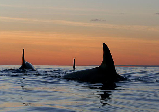 日落時(shí)分在海平面活動(dòng)的一群虎鯨。
