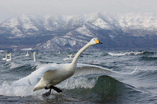 冰面上起飛的大天鵝。