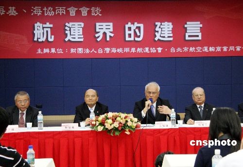 10月30日下午,臺(tái)灣海空航運(yùn)業(yè)界代表由臺(tái)灣海峽兩岸航運(yùn)協(xié)會(huì)常務(wù)顧問、長榮集團(tuán)首席副總裁林省三牽頭,與臺(tái)灣領(lǐng)導(dǎo)人馬英九見面并遞交陳情書,希望即將在臺(tái)北登場(chǎng)的陳云林與;鶗(huì)董事長江丙坤會(huì)談能排除萬難,實(shí)現(xiàn)海空直航,促進(jìn)兩岸經(jīng)貿(mào)發(fā)展,造福于民。隨后,他們?cè)谂_(tái)北舉行記者會(huì),表示非常歡迎海協(xié)會(huì)會(huì)長陳云林訪臺(tái),并期盼兩岸直航早日落實(shí)。中新社發(fā) 黃少華 攝