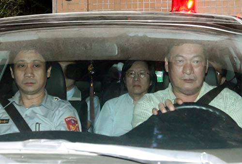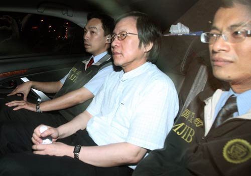 臺灣特偵組30日晚間傳喚臺當局前“國安會秘書長”邱義仁(中)及5名證人到案。檢察官偵訊后認為邱義仁涉嫌利用職務詐取財物罪嫌,于31日凌晨將邱義仁移送法院聲請羈押禁見。臺北法院審理后裁準,邱義仁坐進囚車,被送往臺北看守所!爸醒肷纭眻D