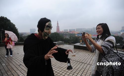 圖為長(zhǎng)沙世界之窗公園內(nèi),游人拍照,黑“鬼”張牙舞爪,共狂歡。中新社發(fā) 肖前輝 攝