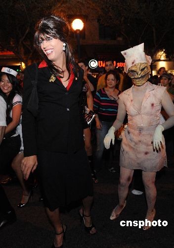 當(dāng)?shù)貢r(shí)間10月31日,萬圣節(jié)之夜,一位民主黨的支持者男扮女裝成佩林形象,在街頭巧遇民主黨總統(tǒng)候選人“奧巴馬”!皧W巴馬”始終以正面形象示人,而“佩林”慘遭惡搞。當(dāng)晚,數(shù)十萬洛杉磯市民走上街頭參加萬圣節(jié)之夜大游行,西好萊塢的圣塔莫妮卡大道上“群魔亂舞”,面目猙獰的“妖魔鬼怪”帶來的不是恐怖而是快樂。中新社發(fā) 張煒 攝