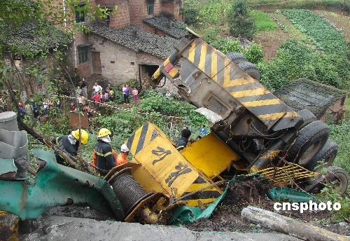 11月2日11時(shí)50分許,渝黔高速公路重慶至一品段10公里處,一輛長(zhǎng)江牌吊車(chē)因爆胎導(dǎo)致車(chē)輛失控,沖出護(hù)欄發(fā)生側(cè)翻,造成1人死亡,1人重傷。中新社發(fā) 張東清 攝