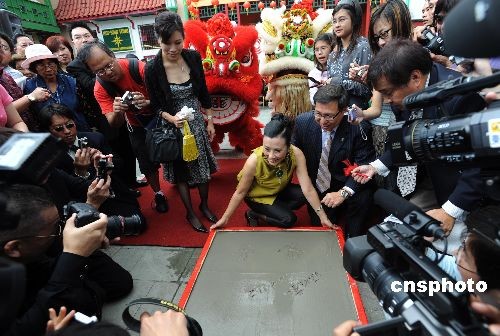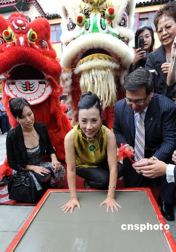 十一月二日,香港著名演藝明星汪明荃來到洛杉磯中國城,在中央廣場留下手印。主辦該活動(dòng)的羅省中華總商會(huì)會(huì)長莊佩源稱贊汪明荃為傳播中華文化作出重要貢獻(xiàn),是所有華人的驕傲。香港明星周潤發(fā)與曾志偉等已在中國城中央廣場內(nèi)留下手印和簽名,羅省中華總商會(huì)表示,他們會(huì)繼續(xù)邀請為華人爭光的知名人士來此留手印,希望這里成為洛杉磯的第二個(gè)星光大道。中新社發(fā) 張煒 攝