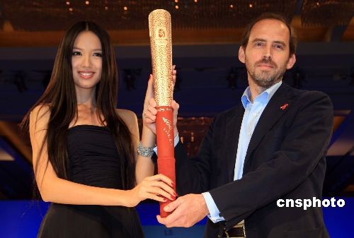 11月3日晚,一場預防性病艾滋病慈善拍賣晚會在上海舉行,中國“小巨人”姚明簽名的北京奧運火炬,經(jīng)過激烈競拍,以10萬元人民幣被一位外籍愛心人士拍得,捐贈給中國預防性病艾滋病基金會,圖為2007年“世界小姐”張梓琳親手向愛心人士呈上姚明簽名的“奧運火炬”。