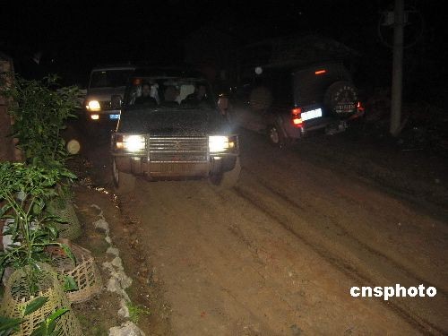 四日凌晨在普洱景東太忠鄉(xiāng)到災(zāi)區(qū)的路上,楚雄救援醫(yī)療隊(duì)救援車(chē)陷進(jìn)了泥潭里。中新社發(fā) 劉子倩 攝