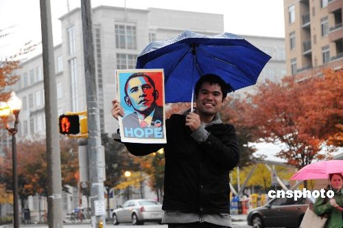 華盛頓街頭一位奧巴馬支持者舉著寫(xiě)有“希望”字樣的奧巴馬像,號(hào)召人們抓緊時(shí)間“顆粒歸倉(cāng)”,把奧巴馬送到白宮。中新社發(fā) 邱江波 攝