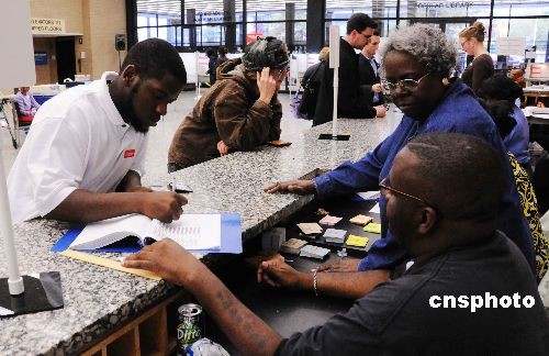 今年非洲裔居民百分之九十以上注冊(cè)成為選民。圖為一位非洲裔選民在華盛頓特區(qū)投票站填寫(xiě)有關(guān)投票的表格。中新社發(fā) 邱江波 攝