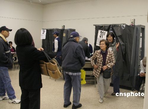 美國(guó)東部時(shí)間4日,美國(guó)總統(tǒng)選舉投票開(kāi)始.在紐約新華裔移民聚居地法拉盛地區(qū)投票點(diǎn),不僅有中文“在此投票”的說(shuō)明,更配有專(zhuān)職中文翻譯,可幫助講廣東話(huà)、福州話(huà)乃至上海話(huà)的居民順利投票。中新社發(fā) 魏晞 攝
