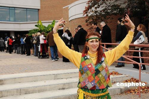 在臨近華盛頓的弗吉尼亞阿靈頓郡中心圖書館投票站,舞蹈家伊拉納在選民長隊前翩翩起舞,呼吁人們把票投給奧巴馬。