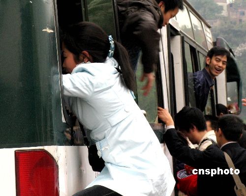 重慶主城區(qū)出租車罷運(yùn)事件11月4日上午仍在持續(xù),但從重慶市出租汽車協(xié)會(huì)了解到,截止4日下午16點(diǎn)30分,重慶主城區(qū)共有4000多輛出租車上路營(yíng)運(yùn),占全市主城區(qū)出租車數(shù)量的一半,持續(xù)到4日上午的罷運(yùn)事件出現(xiàn)良好轉(zhuǎn)機(jī),但仍嚴(yán)重影響市民出行,在南坪區(qū)出現(xiàn)了部分市民為了趕車回家攀爬公交車的情景。中新社發(fā) 許康平 攝