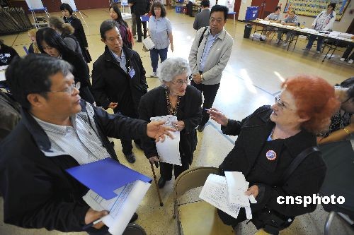 當(dāng)?shù)貢r(shí)間十一月四日,是美國總統(tǒng)選舉投票日。來自北京的一考察團(tuán)在加州舊金山灣區(qū)十余個(gè)投票站考察并體驗(yàn)投票過程。圖為一位中國學(xué)者在和美國選民交流。 中新社發(fā) 陳鋼 攝