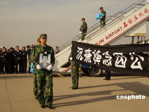 圖為工作人員護(hù)送5名遇難中國(guó)工人的遺像和骨灰走下飛機(jī)。