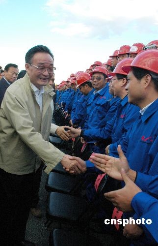 當(dāng)?shù)貢r(shí)間五日下午,正在阿爾及利亞進(jìn)行正式友好訪問(wèn)的中國(guó)全國(guó)人大常委會(huì)委員長(zhǎng)吳邦國(guó)視察了由中信集團(tuán)和中國(guó)鐵建聯(lián)合體承建的東西高速公路項(xiàng)目工地,看望了在那里工作的工程技術(shù)人員,要求確保工程質(zhì)量,做出信譽(yù)、創(chuàng)出品牌,把東西高速公路項(xiàng)目建設(shè)成世界一流工程。中新社發(fā) 孫宇挺 攝
