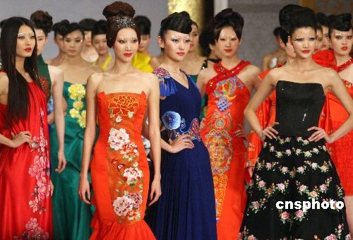 11月5日晚,北京舉行的中國國際時(shí)裝周(2009春夏系列發(fā)布),上演了一場華服大典。“國色天香 華服大典”以緙絲傳承歷史,以牡丹展現(xiàn)盛世繁華,續(xù)寫中國奢侈品文明復(fù)興的傳奇。圖為模特展示2009華服大典作品。中新社發(fā) 錢興強(qiáng) 攝