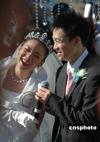 圖為楊威和新娘楊云在婚禮上歡樂開懷。中新社發(fā) 尹海明 攝