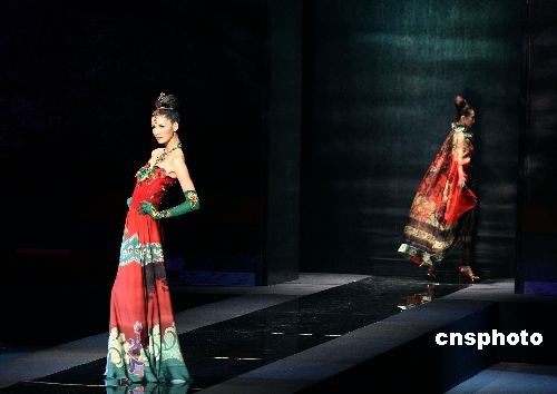 2008年11月9日,中國國際時裝周(2009春夏系列)在北京舉行鄧皓2009春夏時裝發(fā)布,莫萬丹、劉多兩大名模傾情演繹,臺上相互爭艷。中新社發(fā) 魯谷 攝