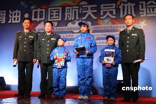 11月14日,“長城潤滑油·中國航天員體驗(yàn)營活動”在北京航天城拉開帷幕。體驗(yàn)營是由中國石化長城潤滑油與《航天員》雜志社共同主辦的大型體驗(yàn)式航天科普公益活動,從全國各地?cái)?shù)千名報(bào)名者中遴選出來的數(shù)十位幸運(yùn)營員,14日至16日將在北京航天城度過為期3天的航天體驗(yàn)之旅。中國航天員楊利偉、費(fèi)俊龍、聶海勝在開營儀式上與小營員互贈禮物。中新社發(fā) 盛佳鵬 攝