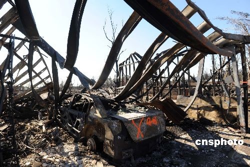 十一月十八日,洛杉磯北部希爾瑪市的一個居民區(qū)在大火中幾乎被焚毀,整個社區(qū)六百零八間住宅中的四百八十間蕩然無存。這是四十多年來,洛杉磯遭受的房屋損失最嚴(yán)重的火災(zāi)。中新社發(fā) 張煒 攝