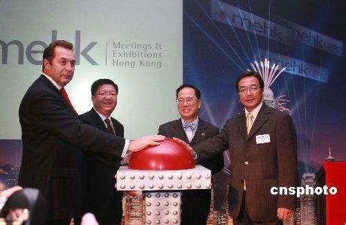 當(dāng)?shù)貢r(shí)間11月19日晚,香港特區(qū)行政長(zhǎng)官曾蔭權(quán)在英國(guó)倫敦郡禮堂,向英國(guó)業(yè)界介紹新成立的香港會(huì)議及展覽拓展部(MEHK),以推廣香港的會(huì)展及旅游業(yè)。圖為曾蔭權(quán)和香港旅游發(fā)展局總干事劉鎮(zhèn)漢等在倫敦啟動(dòng)MEHK。中新社發(fā) 李鵬 攝