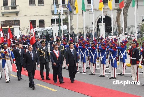 當?shù)貢r間11月20日,中國國家主席胡錦濤在秘魯國會大廈前檢閱秘魯三軍儀仗隊。中新社發(fā) 齊彬 攝