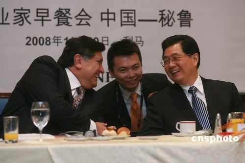 胡錦濤與秘魯總統(tǒng)加西亞出席企業(yè)家早餐會