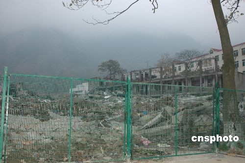 為尊重遇難學(xué)生的家長意見,避免參觀者踩在逝者長眠之地,11月21日,北川中學(xué)地震遺址前正在加裝綠色的圍欄。中新社發(fā) 肖龍聯(lián) 攝