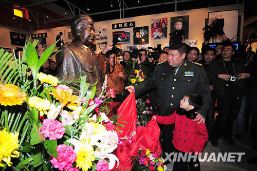 11月23日,毛岸青的兒子毛新宇、孫子毛東東在毛岸青紀念館開館儀式上為毛岸青夫人邵華將軍的銅像揭幕。