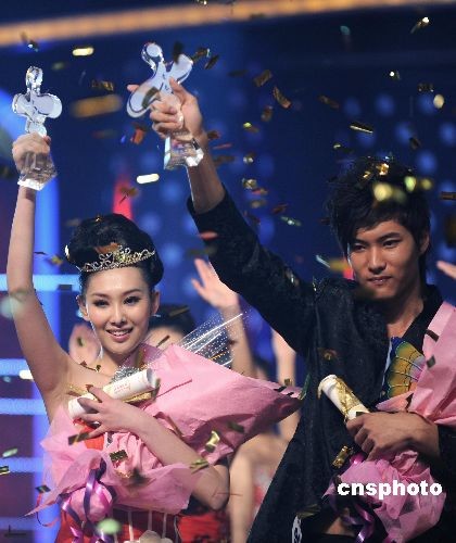 日前,2008第九屆CCTV模特電視大賽緊張進行。經(jīng)過激烈的爭奪曹軼霖和李昕岳分別奪得該賽男女冠軍。本次總決賽暨頒獎晚會還獨具匠心地引入了“非物質(zhì)文化遺產(chǎn)”中的中國元素。中新社發(fā) 廖攀 攝