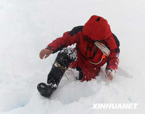 這是一名探冰隊員不慎踩入冰窟窿。 新華社記者 劉奕湛 攝