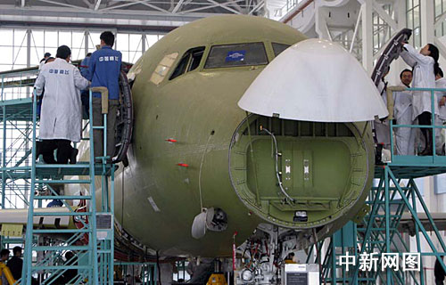 中國(guó)商飛上海飛機(jī)制造廠ARJ21總裝生產(chǎn)線,科研人員正在總裝ARJ21-700新支線飛機(jī)。