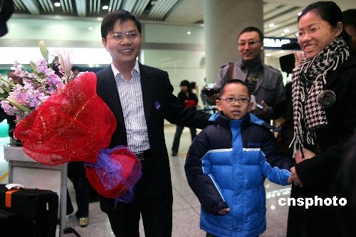 11月30日清晨5點(diǎn)30分左右,滯留泰國的中國公民搭乘中國國際航空公司的CA072航班順利抵達(dá)北京首都國際機(jī)場。圖為從泰國返回北京的中國公民黃忠(左)走出機(jī)場,他的妻兒到機(jī)場迎接。