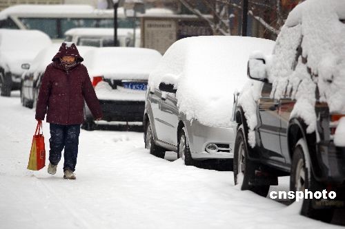 12月2日,新疆烏魯木齊市街頭,一位老人身著厚厚的冬衣在大雪中緩慢前行,老人身邊停放的汽車已披上白色的“外衣”。