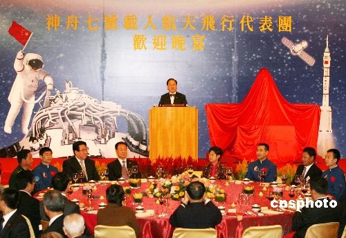 十二月五日晚,香港特區(qū)政府在香港會(huì)議展覽中心舉行晚宴,歡迎“神舟七號(hào)”載人航天飛行代表團(tuán)一行。中新社發(fā) 武仲林 攝