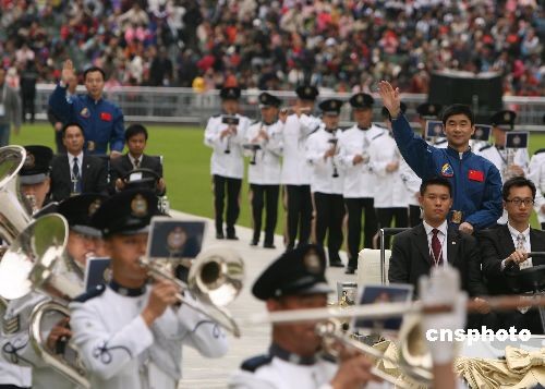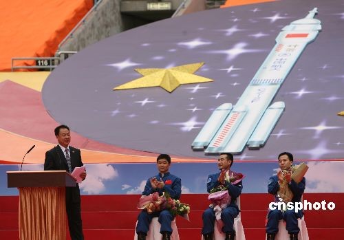 圖為代表團團長張建啟與神舟七號航天員翟志剛、劉伯明和景海鵬在主席臺上。中新社發(fā) 武仲林 攝