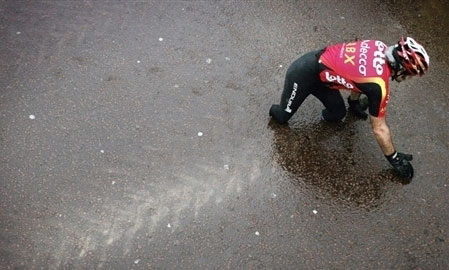 2008年4月13日在倫敦舉行的殘疾人馬拉松賽中,參賽選手沙霍不幸摔下輪椅,他奮力的用手觸摸終點(diǎn)線以表示自己完成了比賽。