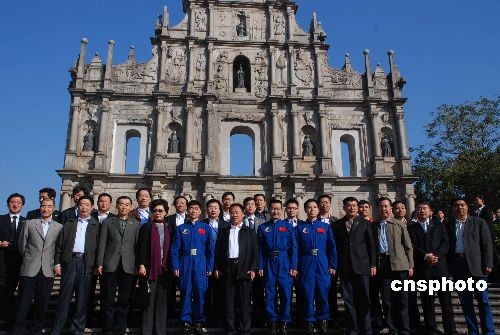 圖為代表團(tuán)團(tuán)長(zhǎng)張建啟及航天員翟志剛、劉伯明、景海鵬等在牌坊前合影留念。中新社發(fā) 畢永光 攝