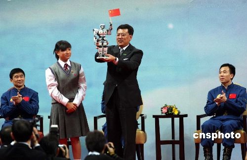 圖為澳門學子向“神舟七號”載人航天飛行代表團贈送航天機器人。中新社發(fā) 武仲林 攝