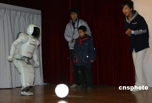 12月9日,目前世界上最先進的類人型機器人ASIMO在四川都江堰進行系列節(jié)目表演,拉開“ASIMO中國行”系列活動的序幕。圖為ASIMO表演足球射門。中新社發(fā) 黃永莉 攝