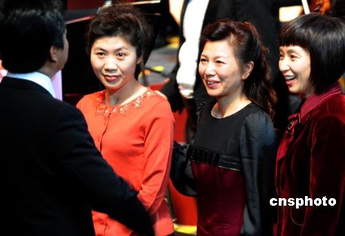 圖為神七三位航天英雄的妻子在譚晶音樂(lè)會(huì)結(jié)束后跟主持人交談。