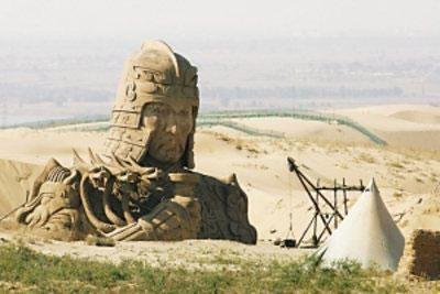 制作方恐怕是怕西方觀眾對(duì)中國(guó)木乃伊沒有印象,因此在影片的開頭特意將一個(gè)巨大的人像杵在茫茫沙漠之中,一眼望去,簡(jiǎn)直和古埃及的獅身人面像如出一轍,看來,木乃伊依舊是古埃及的特產(chǎn)。