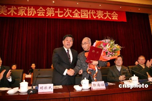 中國(guó)文聯(lián)黨組書(shū)記、副主席胡振民給新當(dāng)選的中國(guó)美協(xié)榮譽(yù)主席靳尚誼頒發(fā)聘書(shū)。中新社發(fā) 王保勝 攝