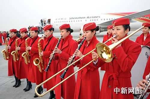 深航女子軍樂(lè)隊(duì)奏曲歡送臺(tái)灣旅客登機(jī)。