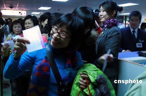 12月15日上午8時,從臺北松山機(jī)場飛往上海的航班起飛,這是臺灣首班飛往大陸的平日包機(jī)。圖為旅客手持登機(jī)牌搭乘首航班機(jī)。