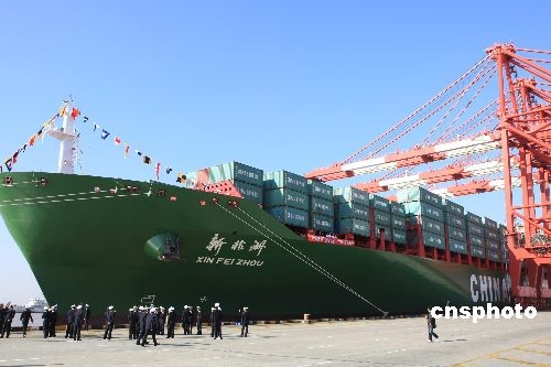 海峽兩岸海上直接通航首航儀式在洋山港舉行,中遠公司的“遠河”號和中海公司的“新非洲”號從洋山港啟航執(zhí)行首航任務(wù)。中新社發(fā) 湯彥俊 攝