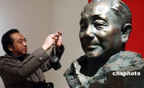 圖為著名雕塑藝術(shù)家程允賢的作品《鄧小平像》雕塑吸引參觀者。中新社發(fā) 錢興強(qiáng) 攝