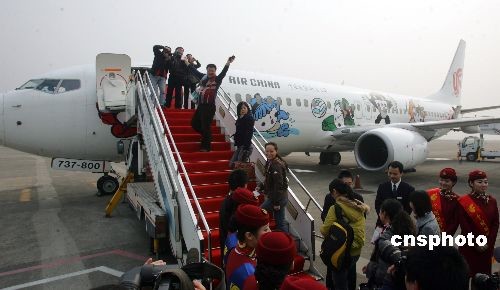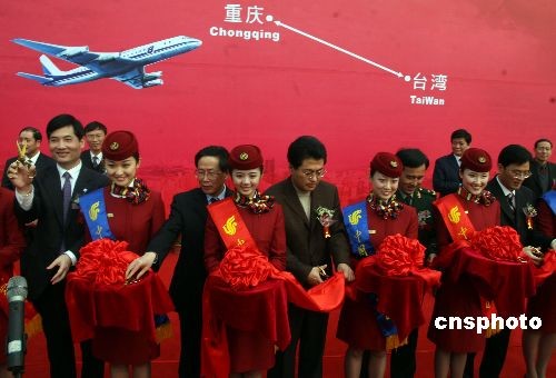 12月19日,重慶至臺北的直航航線正式開通。當(dāng)日下午3時許,印有福娃圖案的國航班機(jī)從重慶江北機(jī)場起飛,駛向?qū)殟u臺灣。中新社發(fā) 郭晉嘉 攝